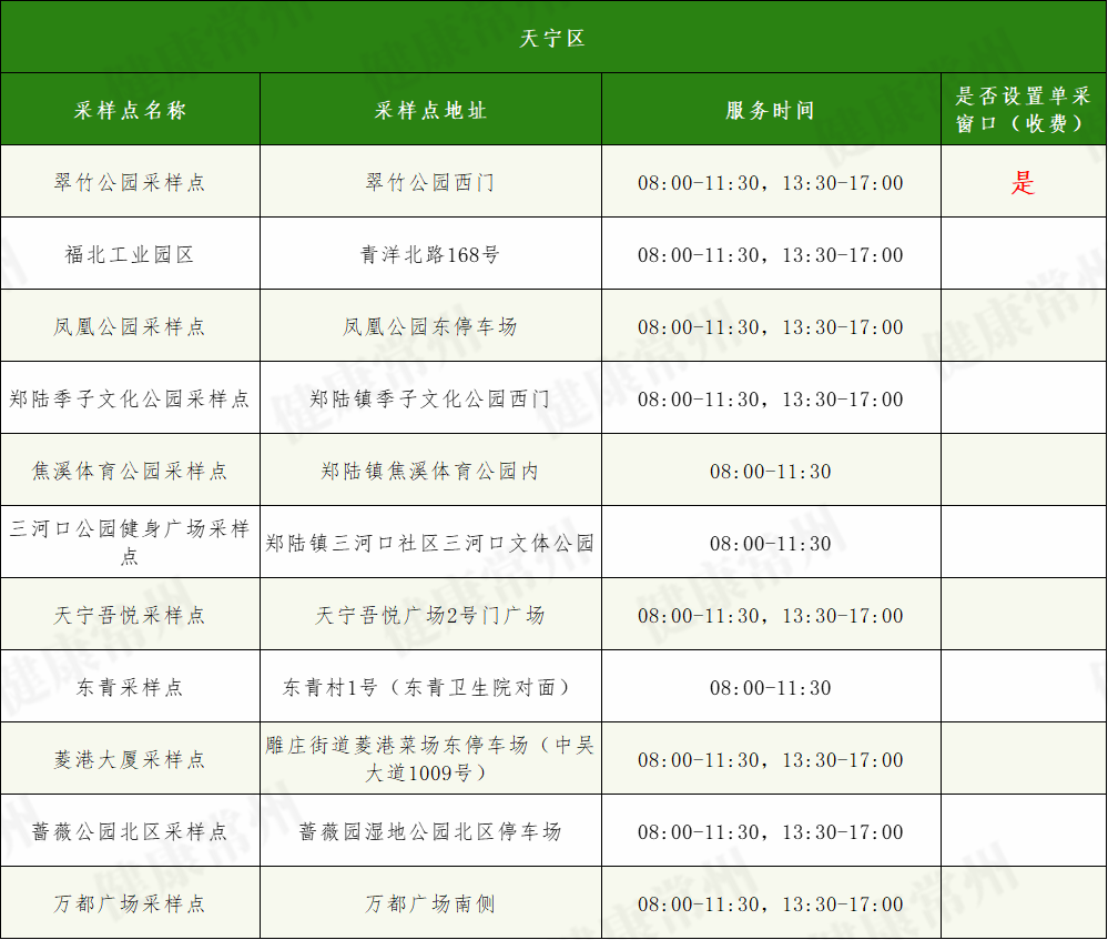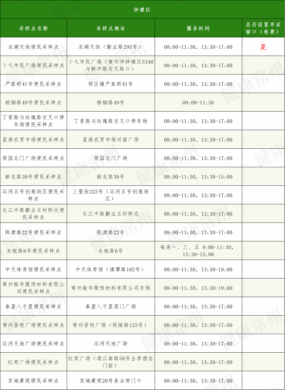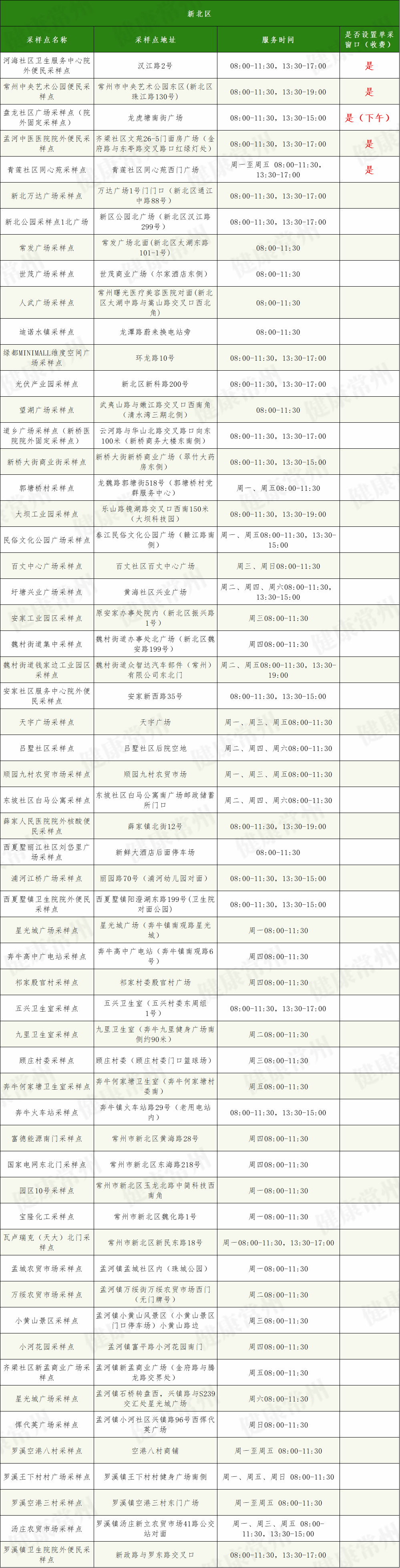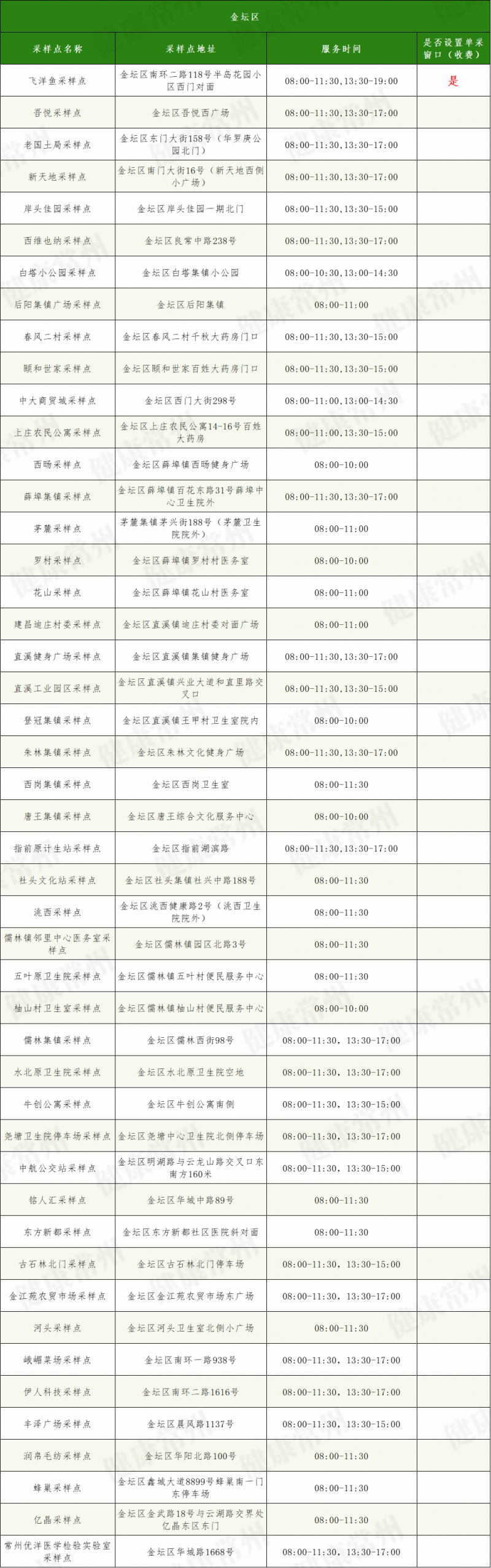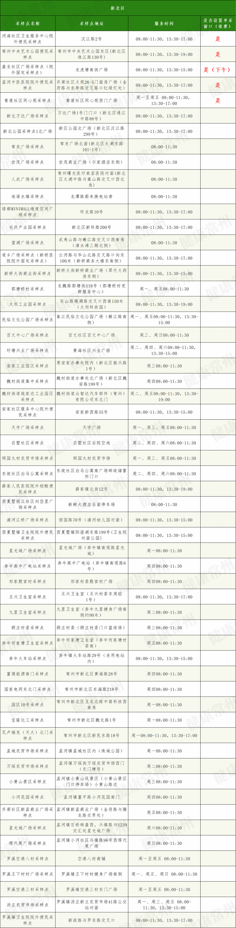 02 溧阳市 03 金坛区 04 武进区 05 新北区 06 天宁区 07 钟楼区 08 常州经开区 (注意:以上采样点服务时间可能会根据工作实际进行调整,请及时关注“健康常州”微信公众号官方信息、各地区现场信息。) |