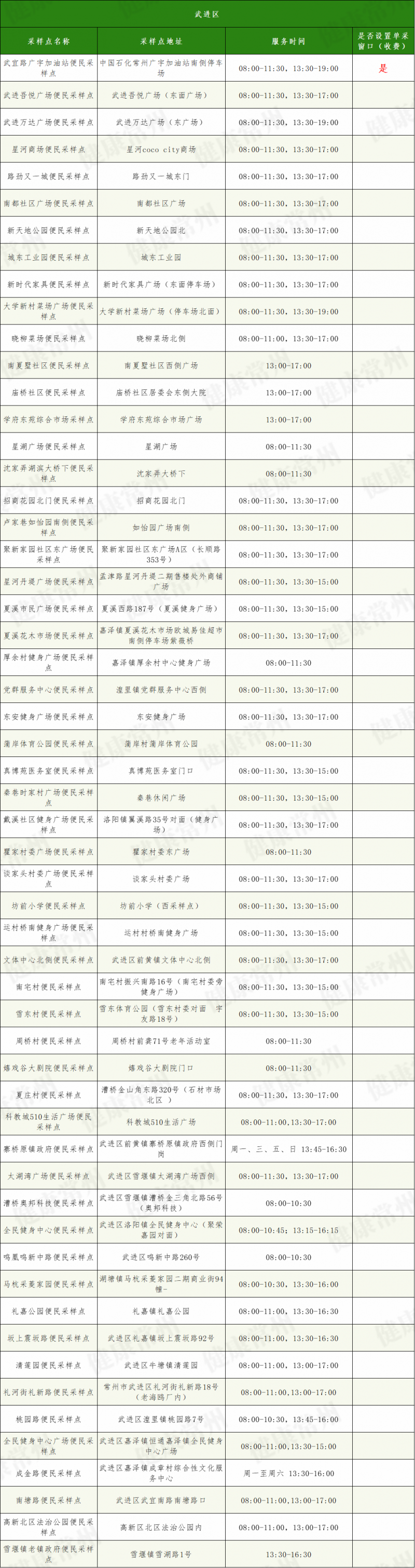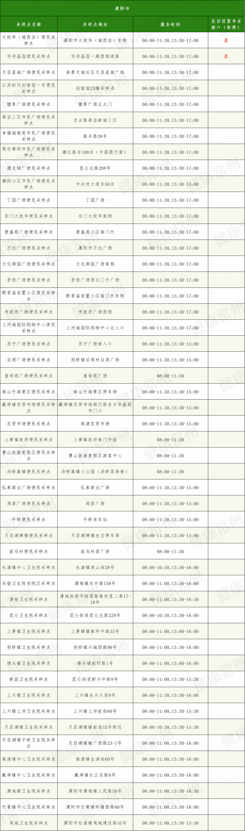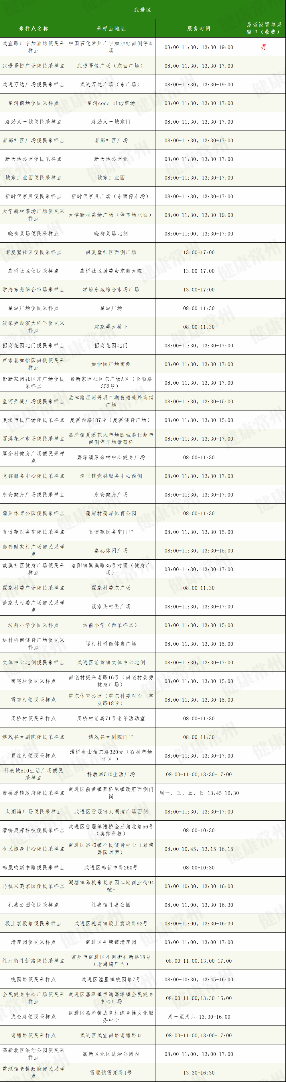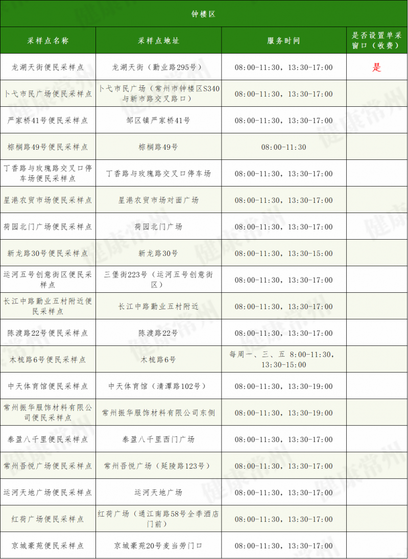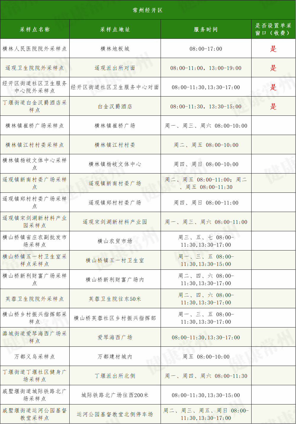 02 溧阳市 03 金坛区 04 武进区 05 新北区 06 天宁区 07 钟楼区 08 常州经开区 (注意:以上采样点服务时间可能会根据工作实际进行调整,请及时关注“健康常州”微信公众号官方信息、各地区现场信息。) |