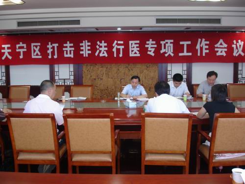 8月10日上午,天宁区召开了全区打击非法行医专项工作会议。会上,天宁区卫生局常建新副局长回顾了2005年以来全区打击非法行医工作取得的成效,对下一步打非工作作了重点部署。分管区长魏敏作了重要讲话,他指出:大家一是要认清形势,统一思想,进一步增强打击非法行医的责任感和紧迫感;二是要把握政策,严格程序,全面扎实开展打击非法行医专项行动;三是要加强领导,密切配合,切实保障专项整治工作的持续开展,规范医疗市场秩序,确保群众就医安全,促进天宁卫生工作又好又快发展。区打击非法行医专项工作领导小组成员三十余人参加了会议。
