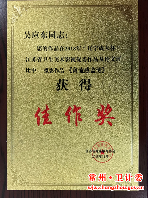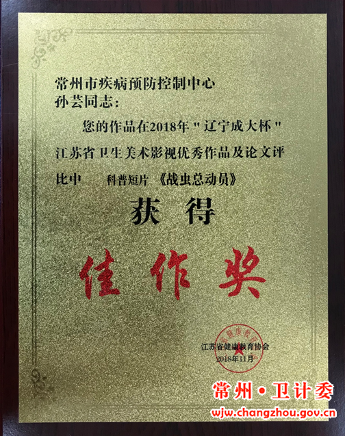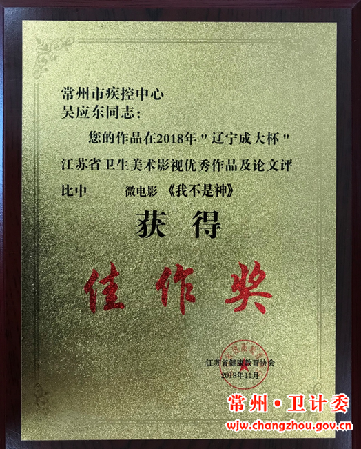 2018年“辽宁成大杯”江苏省卫生美术影视作品及论文颁奖会上,常州疾控中心微电影“我不是神”和科普片“战虫总动员”获得影视类作品佳作奖,其中“我不是神”排名第一。另由吴应东提供参赛的一组照片“禽流感监测”获得摄影类组别作品佳作奖。