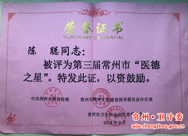 为大力培育和践行社会主义核心价值观,充分展示全市卫生计生工作者良好医德医风,更好地发挥先进典型示范带动作用,由中共常州市委宣传部、常州市文明办、常州市卫生和计划生育委员会共同组织开展第三届常州市“医德之星”“医德标兵”推选活动中,根据公示及投票结果确定10名“医德标兵”,20名“医德之星”名单并予以公布。常州市疾控中心陈聪被评选为第三届“医德之星”称号。