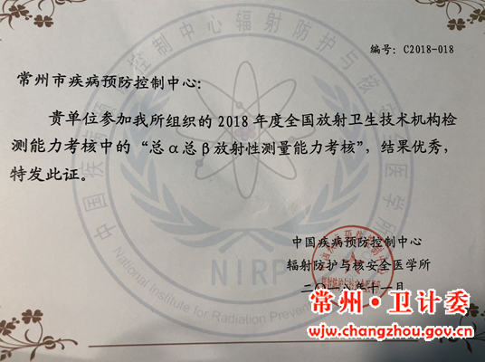 近日,常州市疾控检测中心派员参加了在杭州萧山召开的由中国疾控中心辐射安全所主办、浙江省疾控中心承办的2018年度全国放射卫生技术机构检测能力考核工作总结会,全国各省、市疾控中心和其他有能力开展总α总β检测的单位派出检验技术骨干参加了此次会议。2018年,全国共有99家机构参加了全国总α总β放射性测量能力考核,其中27家优秀,54家合格,11家不合格,7家申请中止考核。会上,常州市疾控中心与另外26家机构因总α总β放射性测量能力考核结果优秀而受到表彰。