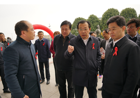 2017年12月1日世界艾滋病日在旅游商贸学校宣传现场市卫健委朱柏松主任为方国强副市长讲解