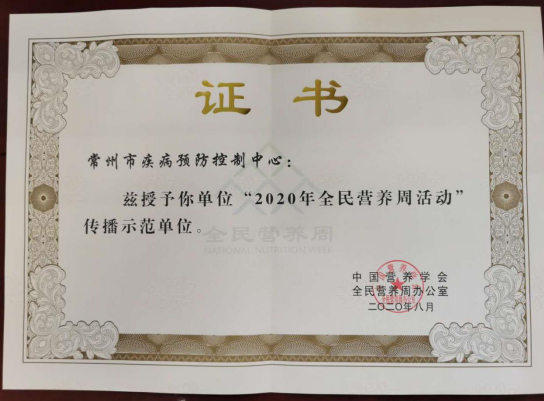 本次会议上,中国营养学会对开展全民营养周活动成绩突出的单位给予表彰。常州市疾控中心由于组织工作周密细致,活动内容丰富,被授予全民营养周传播示范单位的光荣称号。大会希望通过推广典型经验和做法,加快推进营养健康科普宣教工作常态化,使营养教育工作再上新台阶,共谋新突破,以点带面有序推进合理膳食行动,共同开启营养健康新时代,共筑健康中国梦!
