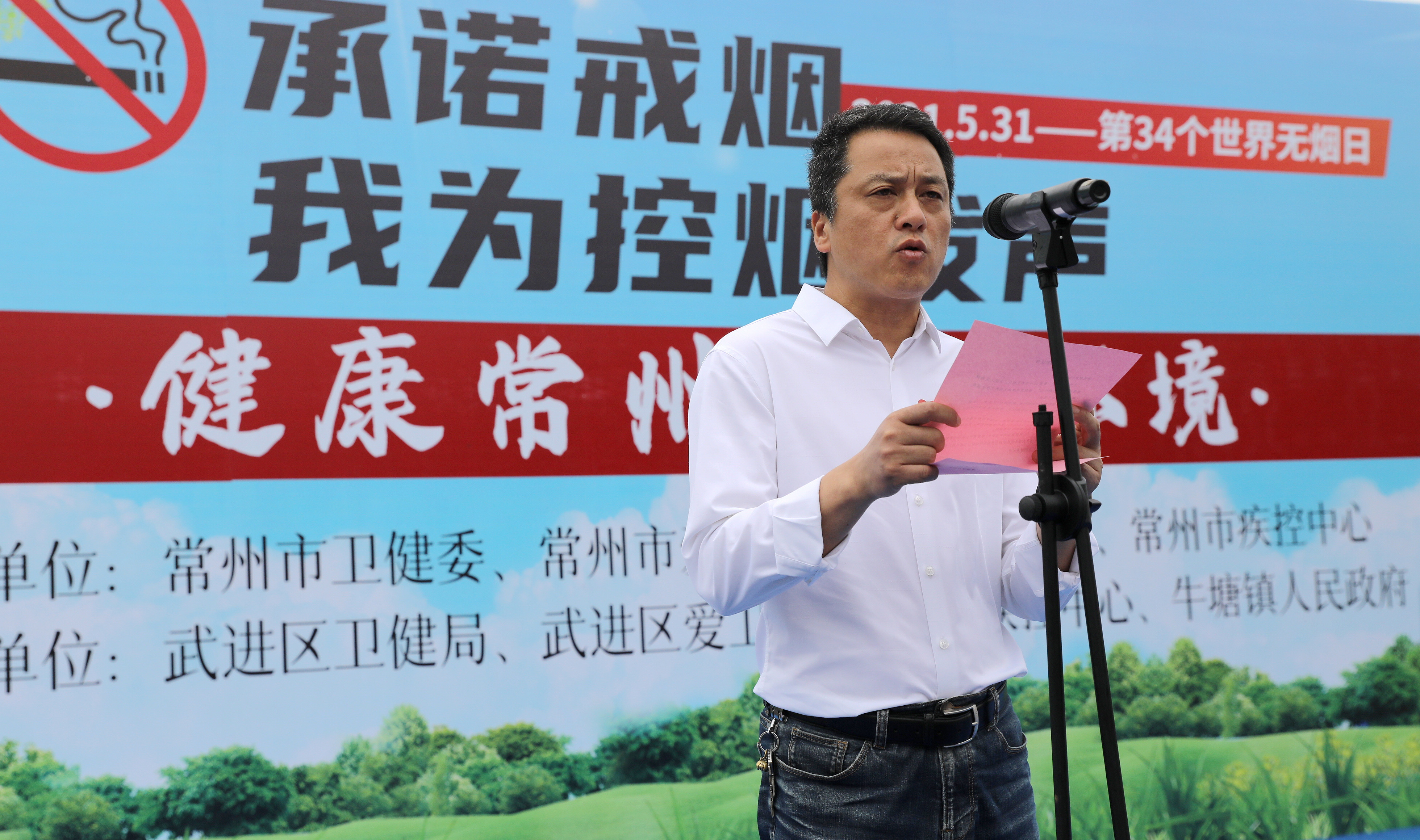 为推进落实健康常州行动之“控烟行动”,加大控烟宣传和健康教育工作力度,进一步倡导无烟生活理念,营造无烟的良好环境,2021年5月27日上午,常州市“世界无烟日”主题宣传活动在武进区牛塘镇清莲公园举行。本次活动由常州市卫健委、常州市爱卫办、常州市文明办、常州市疾控中心主办,武进区卫健局、武进区爱卫办、武进区疾控中心、牛塘镇人民政府承办。市卫健委副主任赵兴光、市文明办副主任柯善学、市爱卫办主任祖熙阳、市疾控中心副主任潘国才参加活动。出席现场活动的还有市委宣传部、市爱卫办、各辖市区卫健局、疾控中心、牛塘镇政府的相关领导和工作人员及村民社区代表。