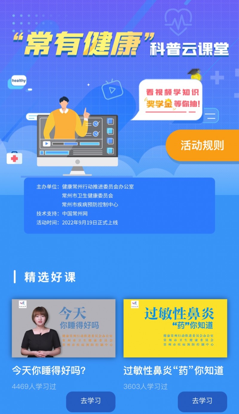 一方面9月15日至9月30日在“常州疾控”微信平台“全民健康”栏目持续开展有奖问答,截止至9月26日10时累计答题人数15888人,答题次数45198次;另一方面9月19日,全民健康生活方式月系列“线上”宣传活动之“常有健康”科普云课堂顺利开讲,由常州市首届健康教育技能竞赛获奖的优秀讲师们精心准备的《今天你睡得好吗?》、《过敏性鼻炎“药”你知道》等四部首批上线的健康科普短视频首日观看人数3407人,互动答题次数3209次,幸运中奖人数99人,高标准超额完成了预期目标,在龙城掀起了一波参与互动健康学习的热潮。