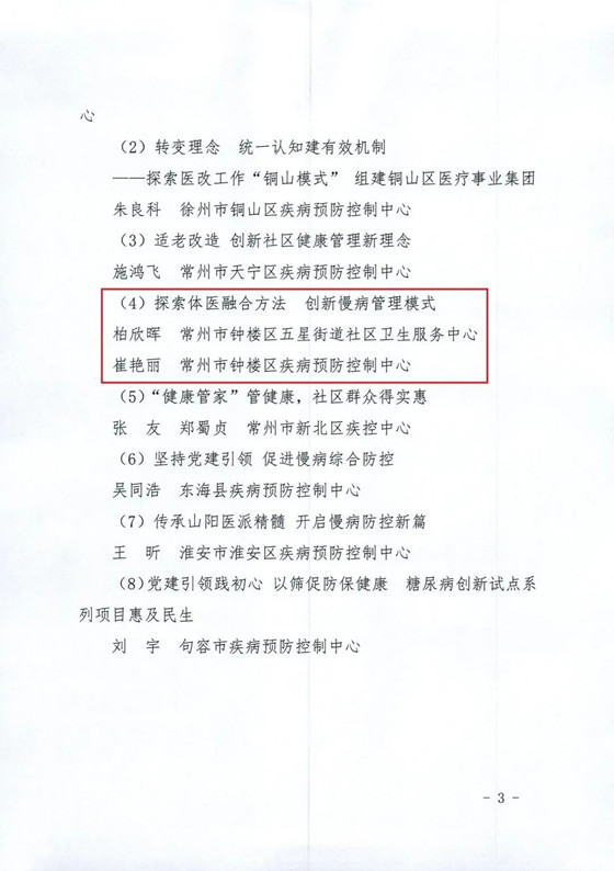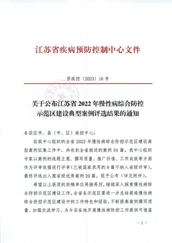 近日,江苏省疾病预防控制中心公布全省2022年慢性病综合防控示范区建设典型案例评选结果。常州市5篇经典案例从全省54篇投稿中脱颖而出,入围省级优秀案例。其中钟楼荣获一等奖1篇、优秀奖1篇,一等奖全省仅有2个,钟楼1个全市唯一!