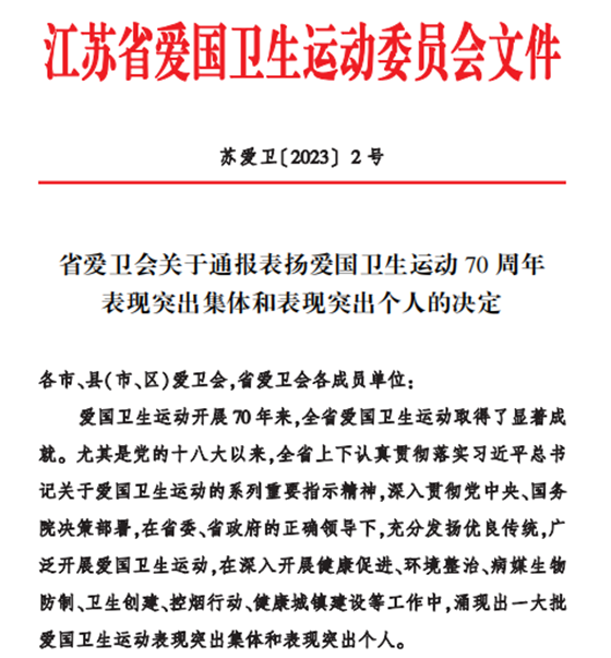 近日,江苏省爱国卫生运动委员会办公室发布《省爱卫会关于通报表扬爱国卫生运动70周年表现突出集体和表现突出个人的决定》,天宁区卫生健康局荣获“江苏省爱国卫生运动70周年表现突出集体”。