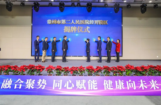 常州经开区党工委书记丁一,常州市卫生健康委党委书记、主任何小茜,常州经开区管委会副主任冯晖,常州市卫生健康委副主任姚澄,常州市第二人民医院党委书记秦锡虎、院长汤黎明,常州市第七人民医院党委书记孙骐、院长张艳共同为常州市第二人民医院经开院区揭牌。