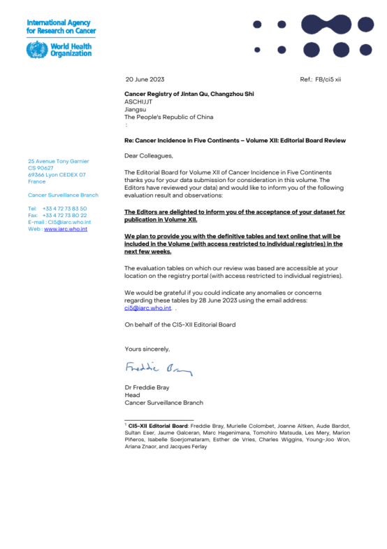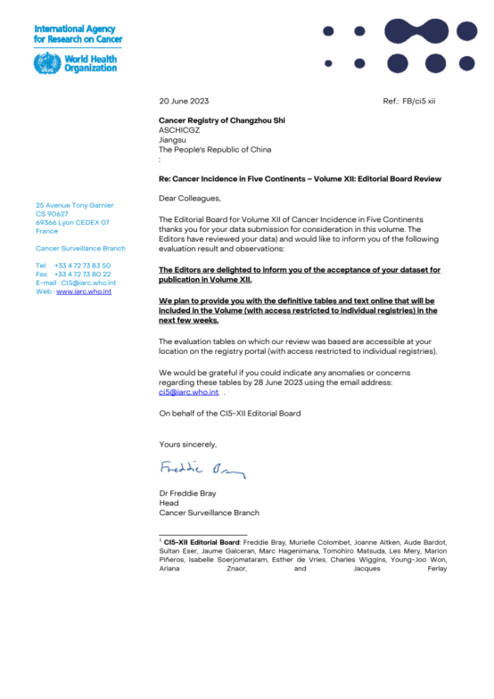 近日,根据IARC的官方反馈,经过近两年的逐级评审,常州市三个肿瘤登记处的肿瘤随访登记资料全部被CI5第XII卷收录。这是我市肿瘤监测工作发展史上的一次里程碑,标志着我市肿瘤登记数据质量获得了国际同行专家的广泛认可,达到了世界先进水平。