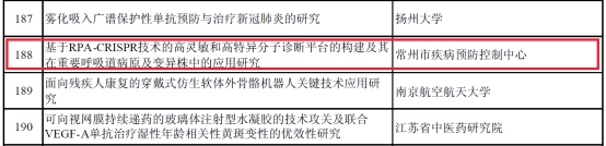 近日,江苏省科技厅公示了2023年江苏省科技计划专项资金(重点研发计划社会发展)拟立项目。常州市疾控中心病原生物检验科毛旭建申报的《基于RPA-CRISPR技术的高灵敏和高特异分子诊断平台的构建及其在重要呼吸道病原及变异株中的应用研究》项目获批立项资助,这是常州市疾控中心首次获得江苏省重点研发计划社会发展项目科研立项!取得了新的突破。