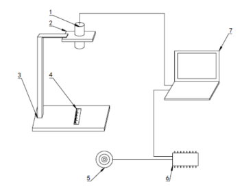 1摄像镜头;2照明灯;3基体;4像素标定尺;5触摸传感器;6信息处理模块;7计算机系统