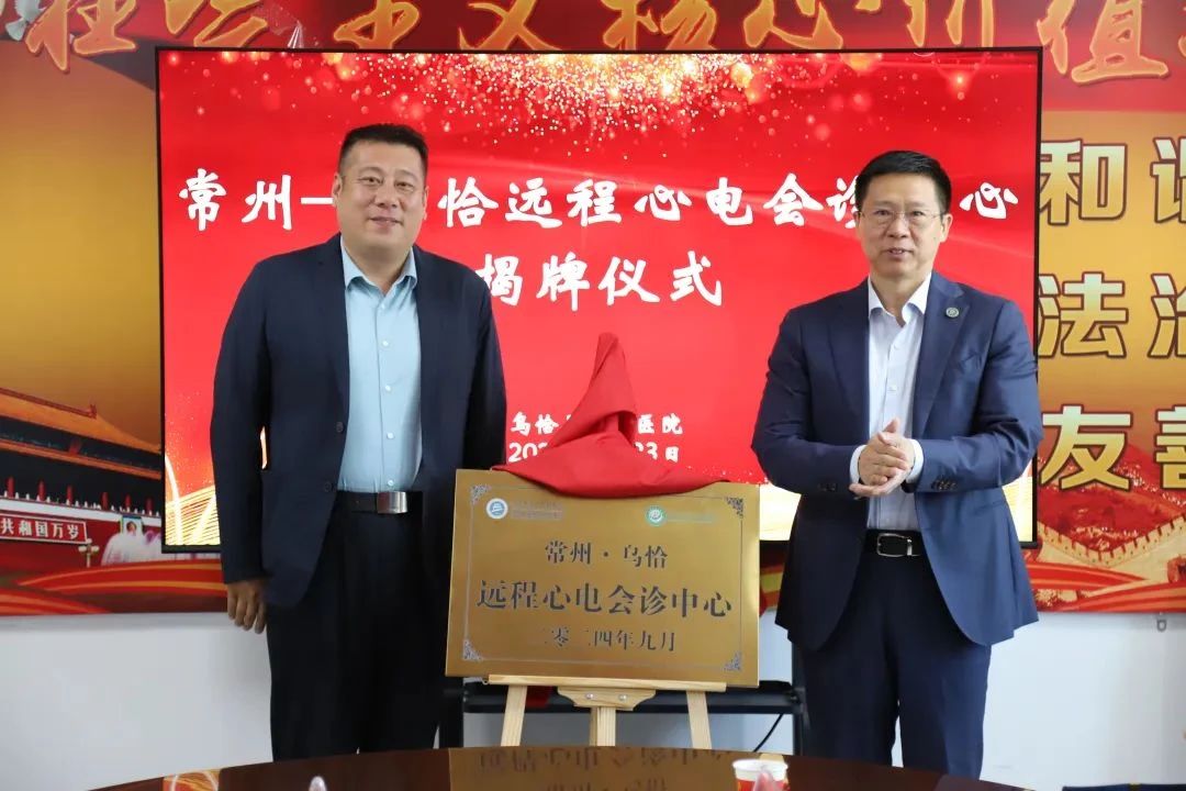 华飞与路琦为“常州-乌恰远程心电会诊中心”揭牌。常州一院副院长邵耐远与沈春锋签署合作协议。华飞代表常州一院向乌恰县人民医院捐赠援助物资——1台心电图仪器和15台电脑。