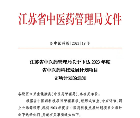 近日,江苏省中医药管理局公布2023年度江苏省中医药科技发展计划项目立项名单,我市共12个项目获得立项,其中1项为重点项目,11项为面上项目。