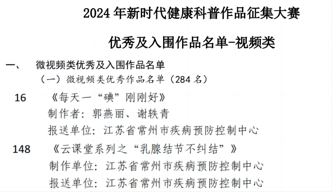 经过激烈的角逐,我中心创作的《每天一“碘”刚刚好》《云课堂系列之“乳腺结节不纠结”》两个作品继斩获江苏分赛区优秀作品后,在全国总决赛中再度荣获微视频类优秀作品荣誉。