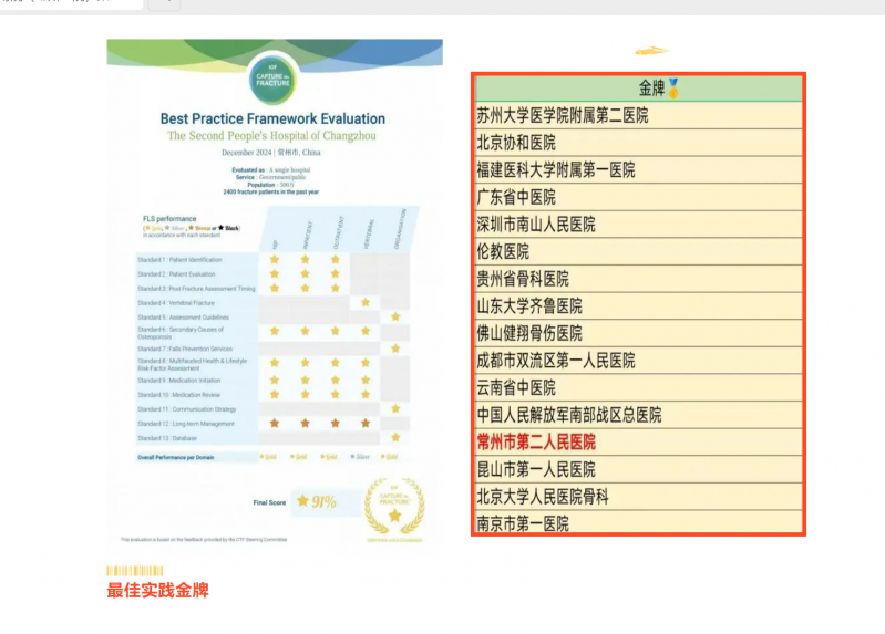 国际骨折联络服务(FLS)最佳实践金牌奖是IOF为表彰在全球范围内对骨质疏松性骨折预防和治疗做出卓越贡献的医疗机构而设立的最高荣誉。该奖项评选标准极为严苛,涵盖骨折风险评估、患者教育、多学科合作、后续跟踪及治疗效果等多个方面。