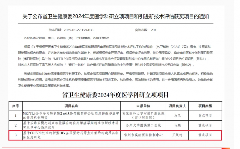 日前,江苏省卫生健康委公布2024年度医学科研立项项目名单,常州市疾病预防控制中心喜迎丰收,再创佳绩。其中,中心病原生物检验科王凤鸣研究员主持的《基于CRISPR技术的新型HIV基因型耐药筛查方案的构建及其临床应用研究》项目荣获重点项目支持,标志着中心在艾滋病防控领域迈出了重要一步。