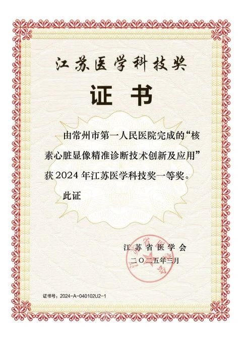 近日,在江苏省医学会2025年工作会议暨2024年江苏医学科技奖颁奖大会上,由常州市第一人民医院作为第一完成单位、核医学科王跃涛团队的科研成果《核素心脏显像精准诊断技术创新及应用》喜获江苏医学科技奖一等奖。