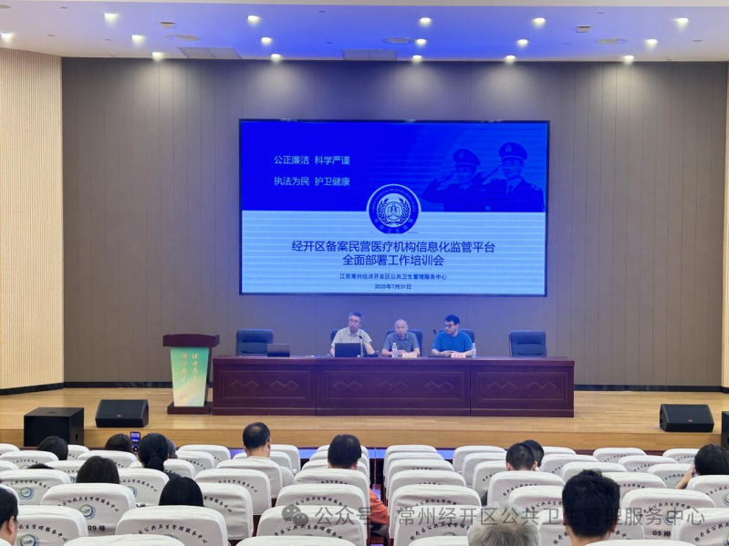 为进一步提高医疗机构及其从业人员依法执业意识,规范医疗机构服务行为,保障人民群众生命安全,经开区公共卫生管理服务中心于2025年7月31日召开常州市诊所信息化监管平台全面部署工作培训会,全区共92名诊所负责人参会。
