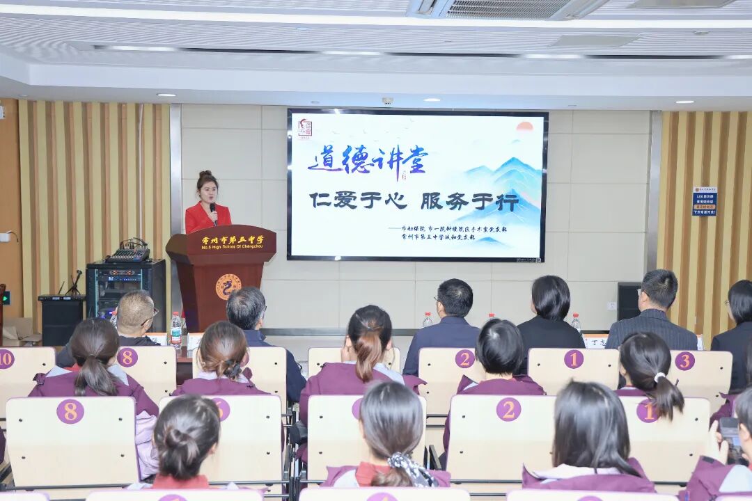 2025年10月20日是世界镇痛日,市妇保院手术室党支部联合常州市第五中学诚和支部,在五中汇秀楼会议厅开展“仁爱于心服务于行”道德课堂活动。市五中党委书记丁志伟、校长杭佳楣、副校长沈默然,医院纪委书记肖燕、副院长秦志强、副院长虞斌以及双方党员及职工代表70余人参加活动。