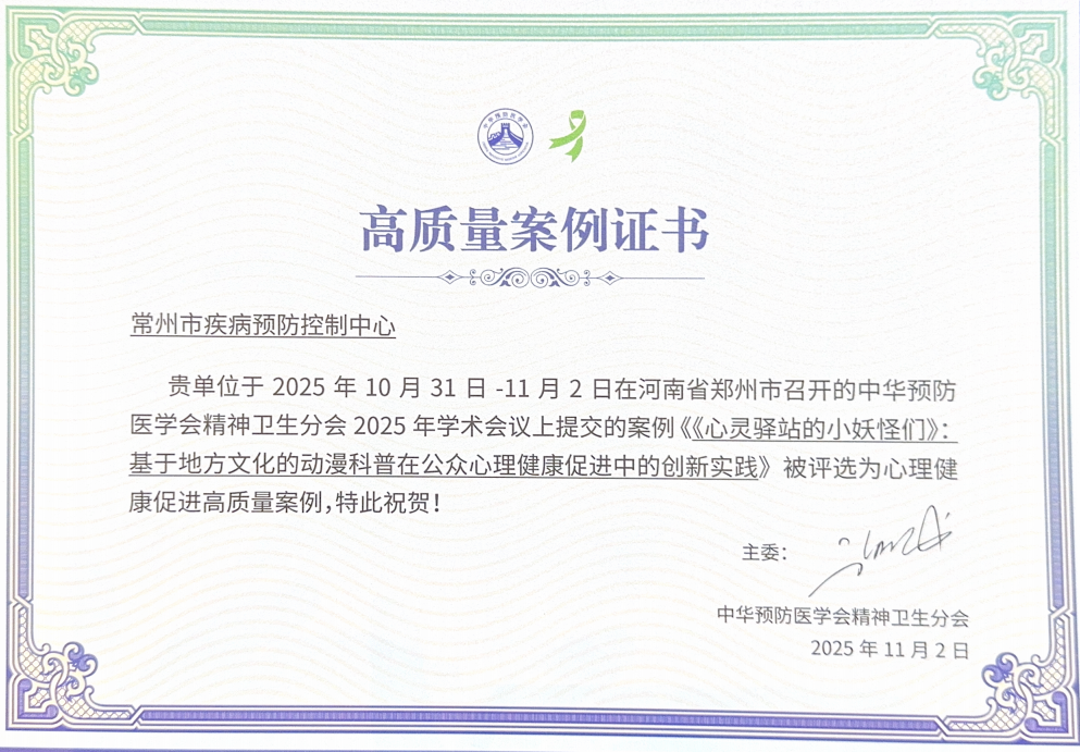 近日,常州市疾控中心慢病科策划实施的动漫科普项目《心灵驿站的小妖怪们》,在中华预防医学会精神卫生分会2025年学术会议上荣获“心理健康促进高质量案例”。这是该科室在多项健康促进成果获国家、省级认可后,于精神卫生与心理健康促进领域的又一重要突破,标志着常州疾控在“医防融合、科普先行”的道路上迈出坚实步伐。