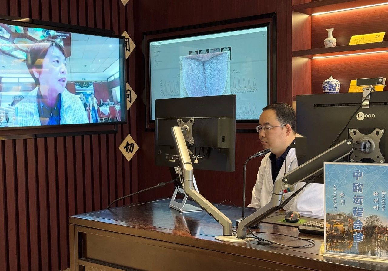 当天,在比利时安特卫普,一场5G+中欧远程会诊同步开启。常州市中医医院泌尿外科主任王盛、脑病科主任医师陈琪、皮肤科副主任中医师于叶,通过孟河医派智能化远程诊疗平台,为五位欧洲患者“把脉问诊”,开具“中西医处方”。三位专家通过高清视频,细致观察患者舌苔、面色,结合问诊精准辨证,不仅开具个性化处方,还耐心讲解日常调养方法,现场参与者纷纷点赞。